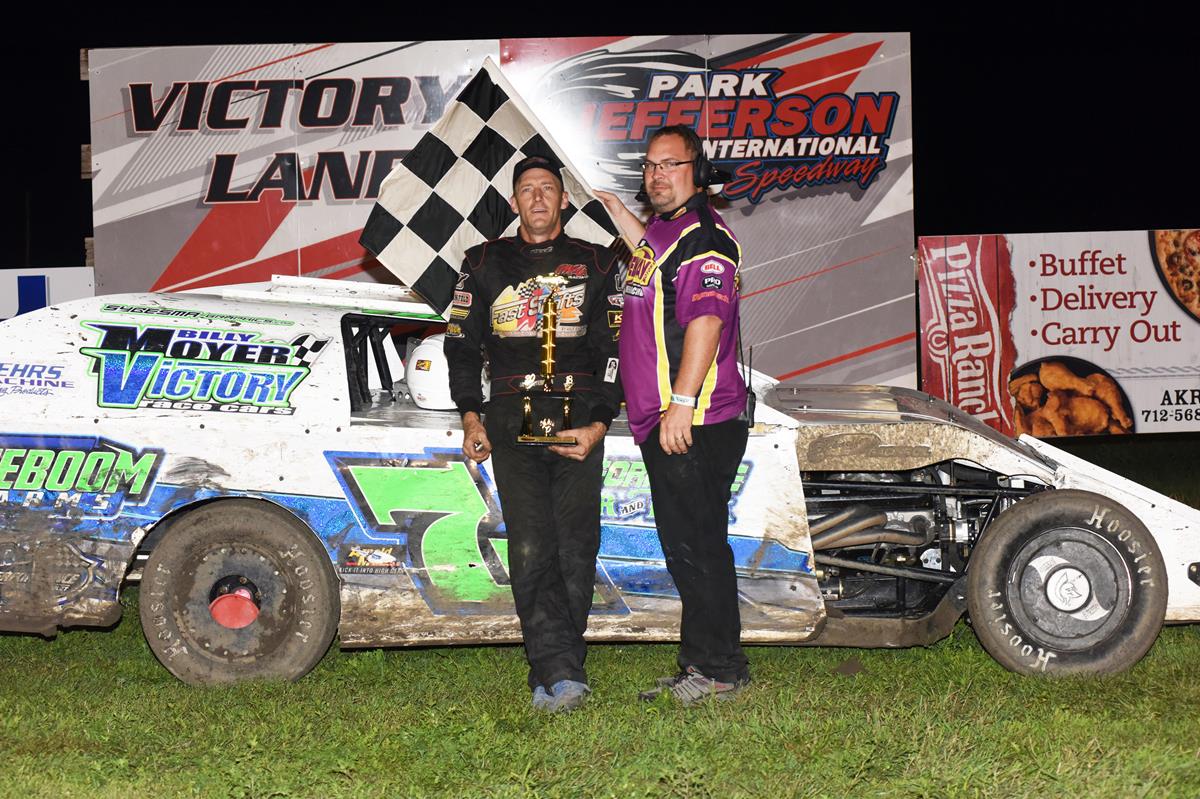 On a night billed as the Nationals Hangover to provide race fans in the Upper Midwest a chance to catch 410 sprint cars on the Knoxville Raceway off week, it was a veteran modified driver who stole the show. Jay Noteboom notched all time win number 74 at Park Jefferson Speedway. In doing so, Noteboom passed Late Model Hall of Fame Driver Joe Kosiski to become the speedways all time feature winner. With tears in his eyes, Noteboom accepted the checkers and trophy from flagman Nate Peterson. It was not an easy battle in the Artworks Graphics IMCA Modified special, as Mr. Excitement Chris Abelson was first to move to the lead with racing all over the track during the A Main. Toward the late stages, Abelson drifted high off the track and gave up the lead. Noteboom saw his chance an pounced, and held off the challenges of Bob Moore to take the historic win. Abelson was third. Heat race wins went to Jefferson's Todd Boulware and Chris Mills.